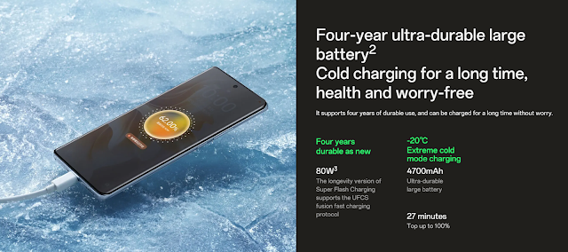 The Oppo Reno 11 pro is a very slim phone, so the battery capacity is slightly reduced here. It has a 4700Mah Li-Po Battery and has 80W charging support. The phone charges quickly and reaches 100% in a mere 27 minutes.